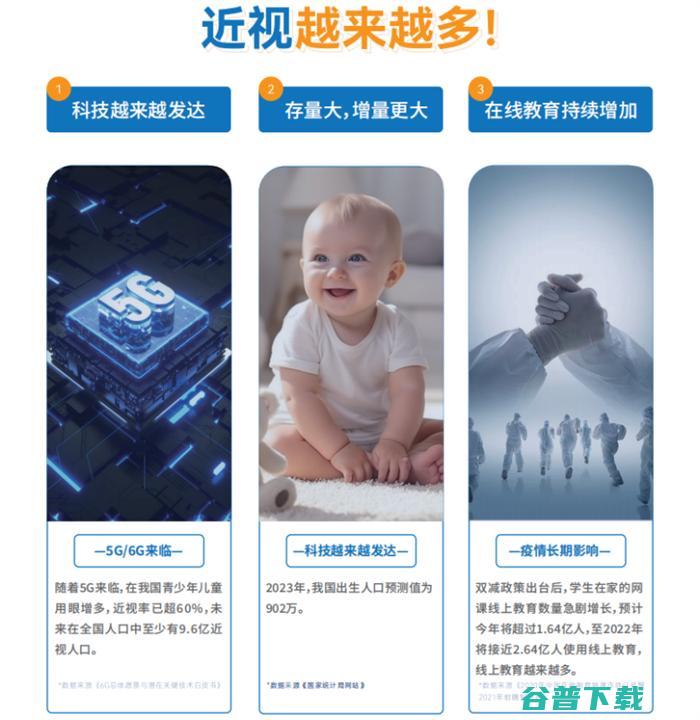 随着5G来临,在我国青少年儿童用眼增多,近视率已超60%,未来在全国人口中至少有9.6亿近视人口。