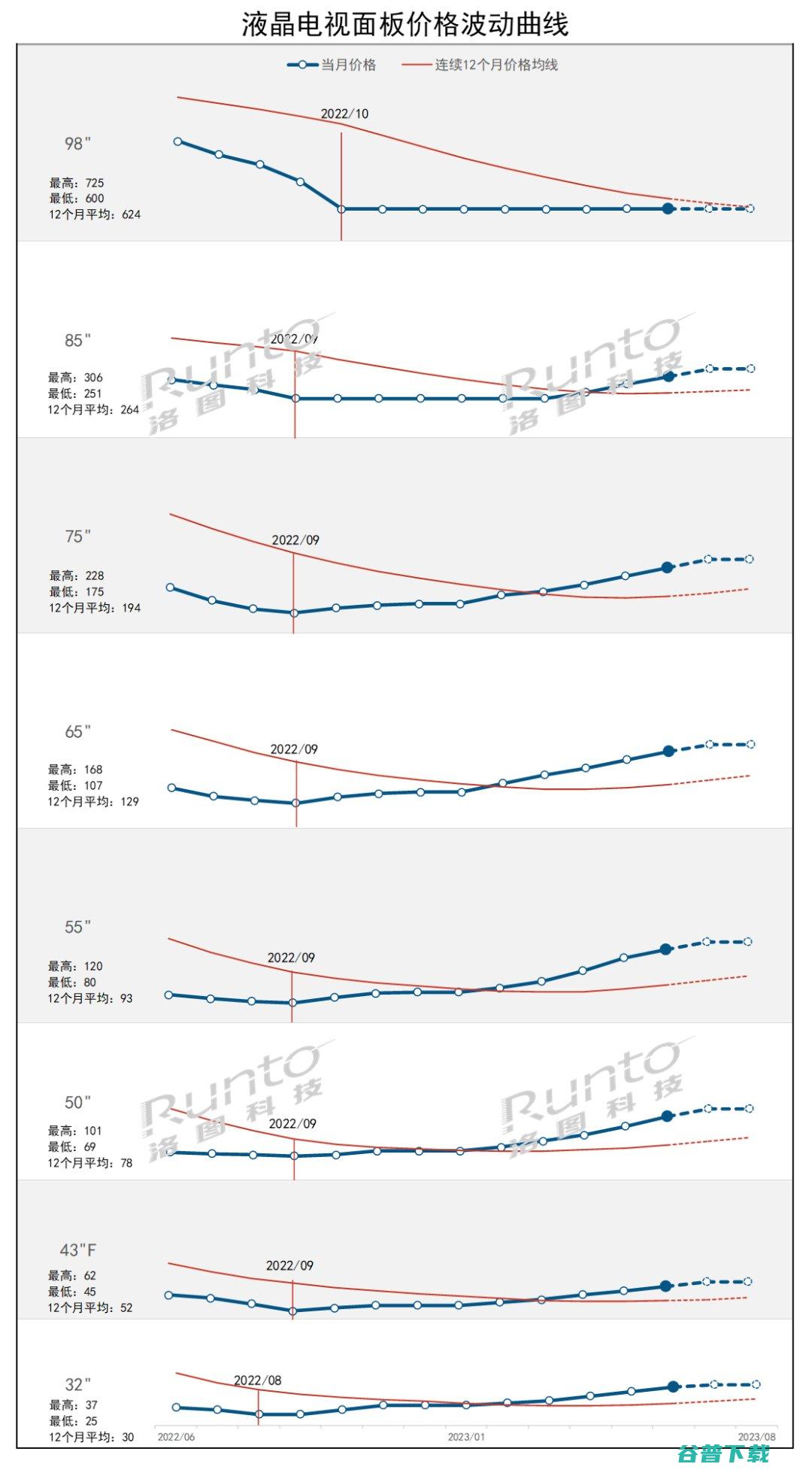 数据来源:洛图科技(RUNTO),单位:美元备注:红色竖线所示意的最高或最低点指的是面板价格在过去连续12个月的最大值或最小值。